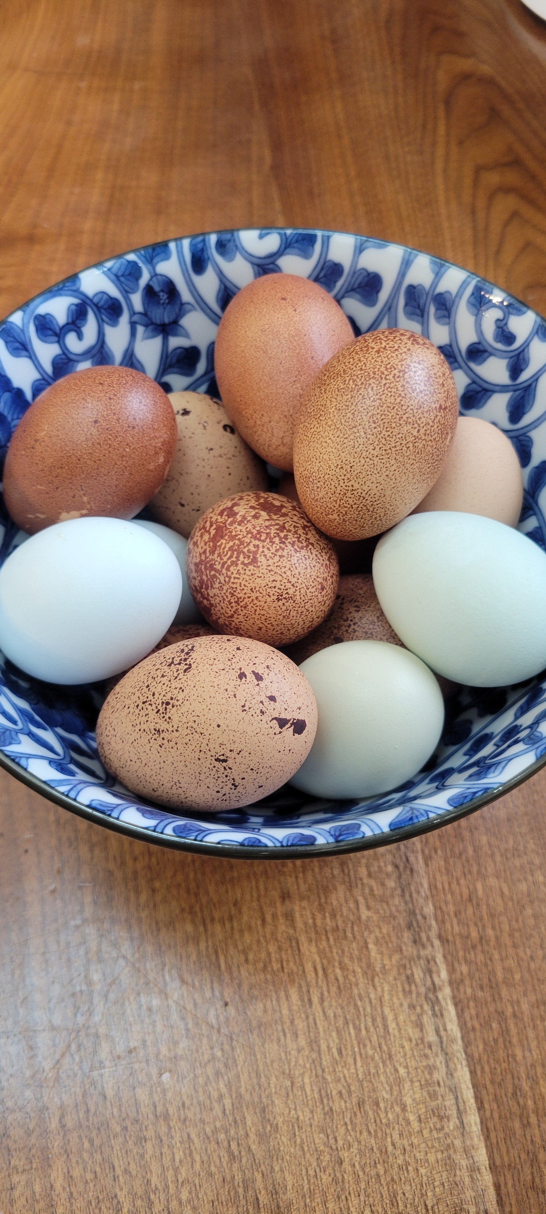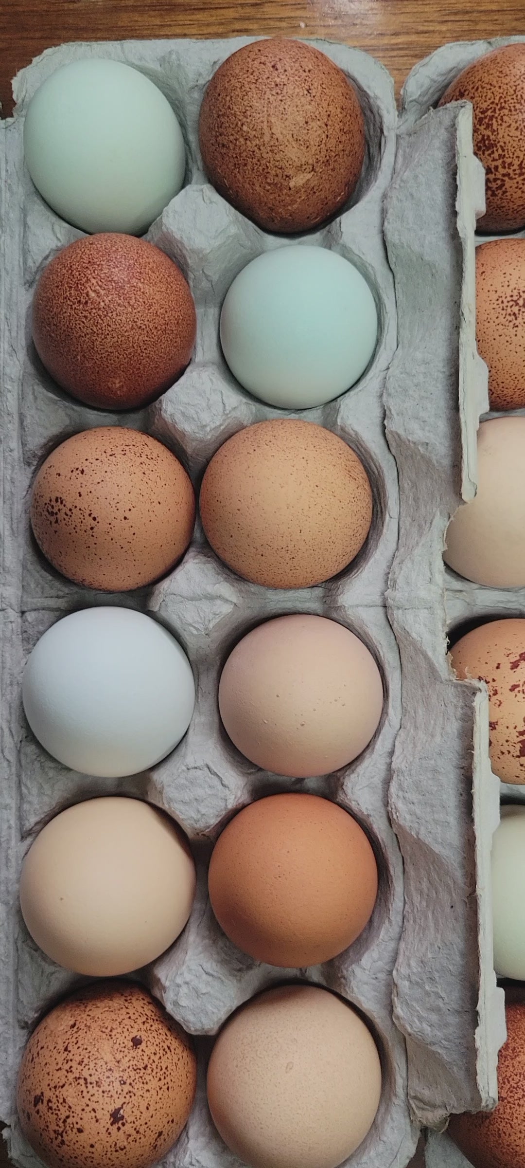 One dozen eggs from our forest-raised flock. These birds are rotated in a forest environment, protected by electric netting, and have free range access to insects. Their diet is supplemented with a non-GMO, soy-free grain mix, including corn and peas, along with fresh vegetables from the farm daily.