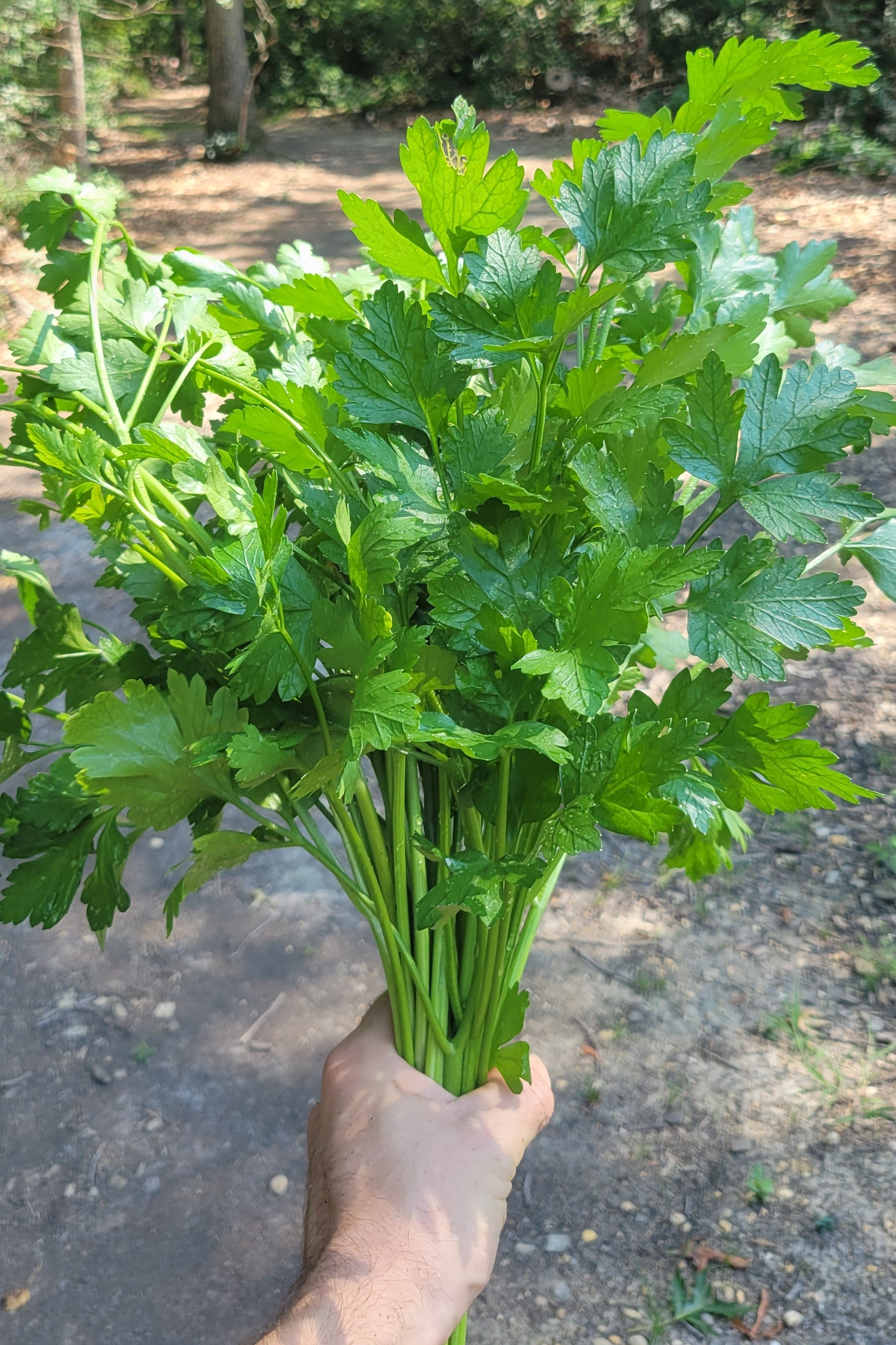 One bunch of parsley; very fresh, potent smell + taste compared to grocery store varieties.