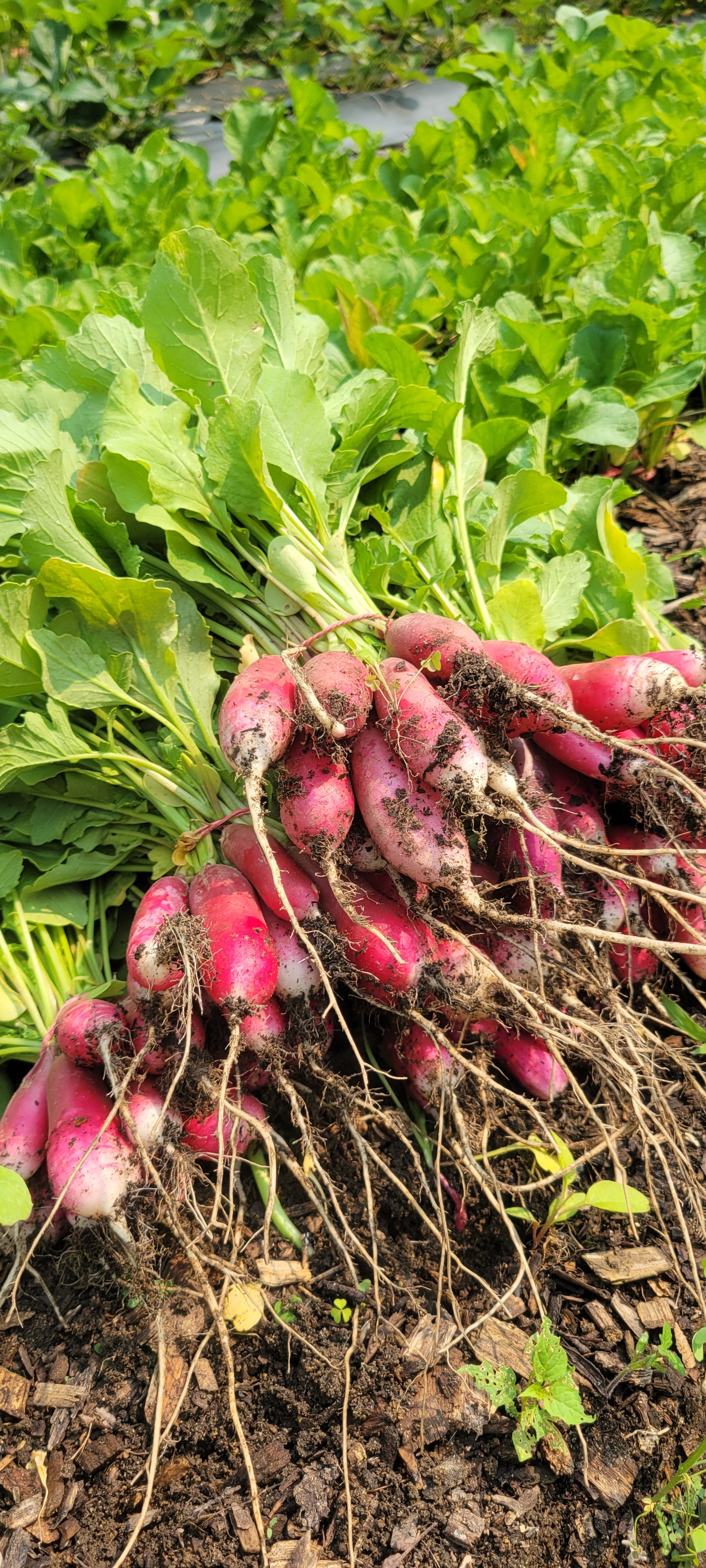 Choose your variety. French Breakfast is a larger, oblong radish. Red rover is a classic round radish; generally smaller in size. Crunchy, slightly spicy flavor.